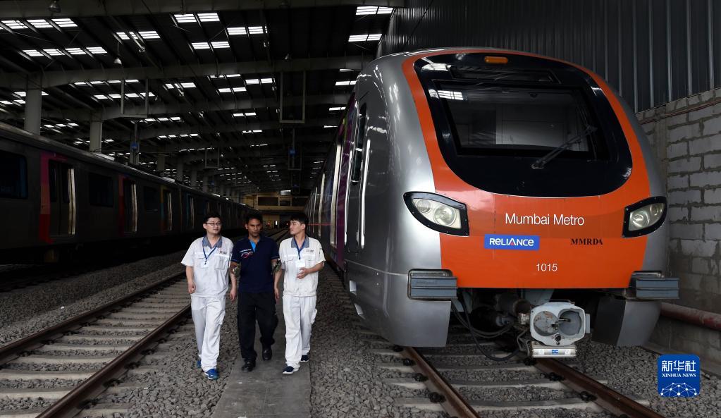 2018年6月27日,在印度孟買(mǎi),中印雙方工作人員在孟買(mǎi)地鐵一號(hào)線車(chē)輛段工作。該地鐵線路車(chē)輛由中車(chē)南京浦鎮(zhèn)車(chē)輛有限公司制造。新華社記者張迺杰攝