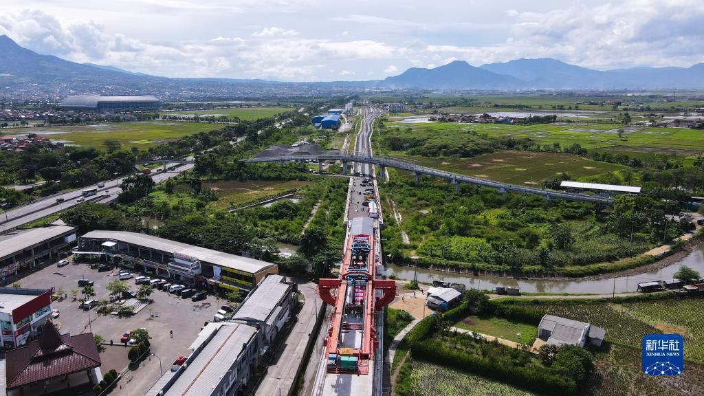 這是2022年5月25日在印度尼西亞萬(wàn)隆拍攝的雅萬(wàn)高鐵4號(hào)梁場(chǎng)萬(wàn)隆方向架梁通道上最后一榀箱梁架設(shè)現(xiàn)場(chǎng)(無(wú)人機(jī)照片)。新華社記者徐欽攝