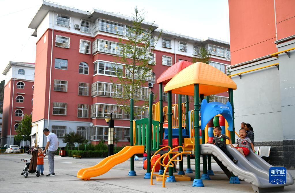 在陜西省延安市延川縣文安驛鎮(zhèn)梁家河小區(qū),小朋友在滑梯上玩耍(2020年7月29日攝)。新華社記者 張博文 攝