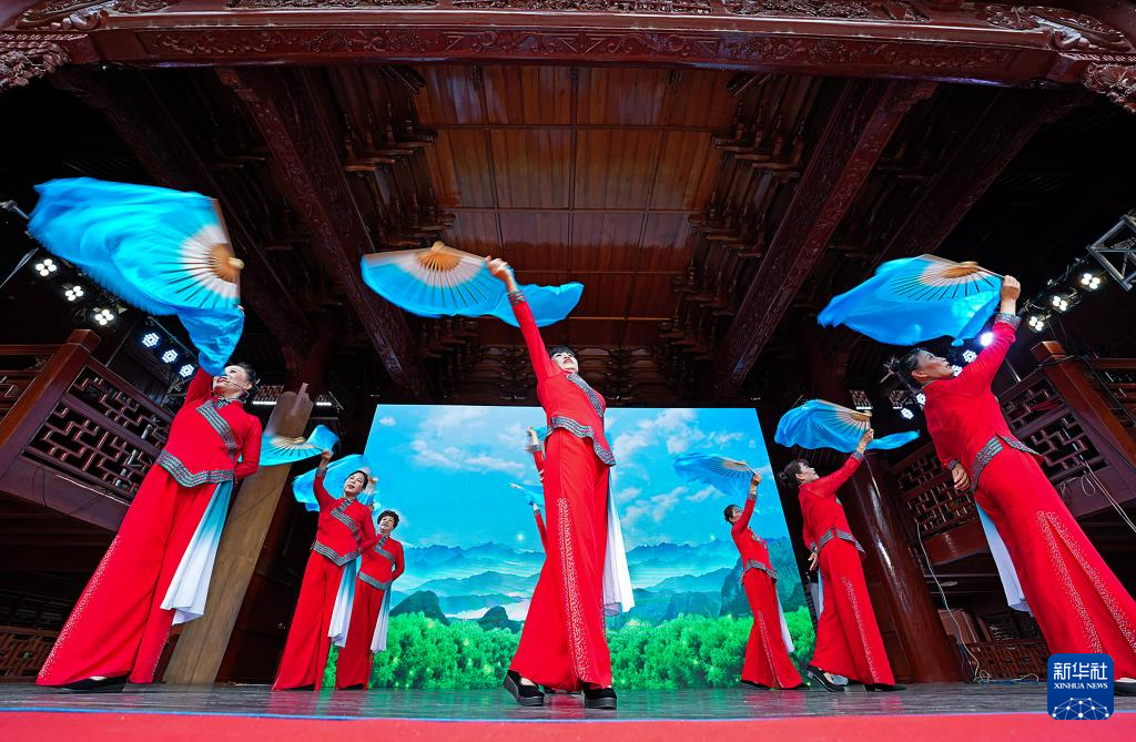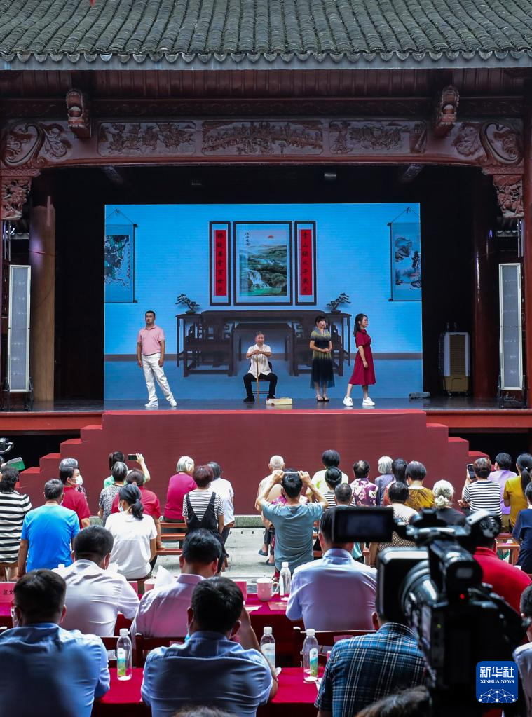 當(dāng)日,在浙江杭州市富陽區(qū)環(huán)山鄉(xiāng)環(huán)二村文化禮堂,一臺融美麗杭州、新時代文明實踐、鄉(xiāng)村振興和共同富裕于一體的新鄉(xiāng)村堂戲《緣來環(huán)山》正式首演,吸引了村民及游客駐足觀看。這也是當(dāng)?shù)亍坝咭弧蔽幕Y堂鄉(xiāng)村新堂戲系列展演的首場演出。新鄉(xiāng)村堂戲《緣來環(huán)山》是環(huán)山鄉(xiāng)15名草根文藝愛好者自編自排自演的一臺鄉(xiāng)土戲,通過說、唱、念、舞等形式,展示近年來環(huán)山抓環(huán)境整治、促產(chǎn)業(yè)轉(zhuǎn)型發(fā)展、提升百姓生活品質(zhì)帶來的喜人變化。(新華社 記者徐昱)