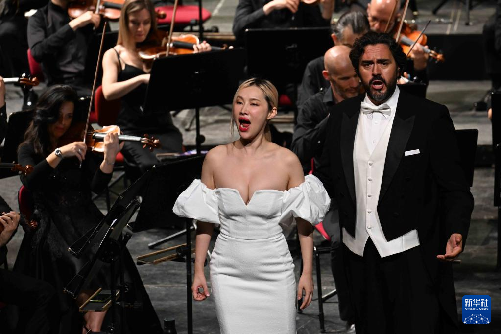 6月25日,在意大利羅馬歌劇院,旅意華人女高音王冰冰(前左)和意大利男高音詹盧卡·夏爾佩萊蒂(前右)合作演唱。