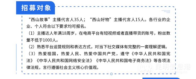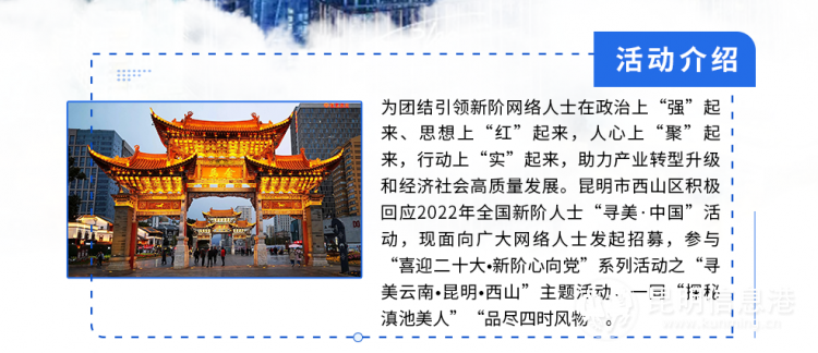 昆明信息港訊 記者段佳琪 通訊員王晨暉 網(wǎng)聚正能量,共繪同心圓。為團結(jié)引領新階網(wǎng)絡人士,昆明市西山區(qū)現(xiàn)面向廣大網(wǎng)絡人士,開展“喜迎二十大·新階心向黨”系列活動之“尋美云南·昆明·西山”主題活動,將招募“西山故事” 主播代言人35人及“西山好物”主播代言人15人。