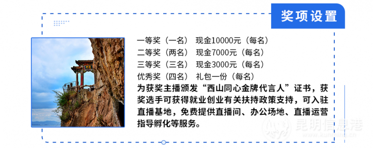 此次活動設置一等獎一名,現(xiàn)金10000元;二等獎兩名,現(xiàn)金7000元/名;三等獎三名,現(xiàn)金3000元/名;優(yōu)秀獎四名,每人各一份神秘禮包。最終獲獎的主播將獲得“西山同心金牌代言人”證書,同時獲獎主播可獲得就業(yè)創(chuàng)業(yè)有關扶持政策支持,可入駐直播基地,基地免費提供直播間、辦公場地、直播運營指導孵化等服務。