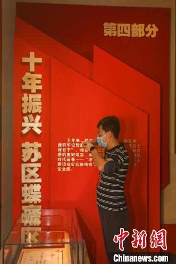 圖為講解員在給幾位參觀者介紹“數(shù)說(shuō)蘇區(qū)蝶變”部分的展覽內(nèi)容。 劉力鑫 攝