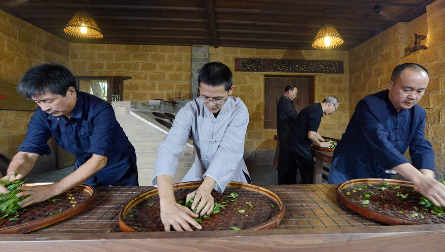 劉國(guó)英(中)在展示茶葉手工揉捻技藝。王震潭/攝