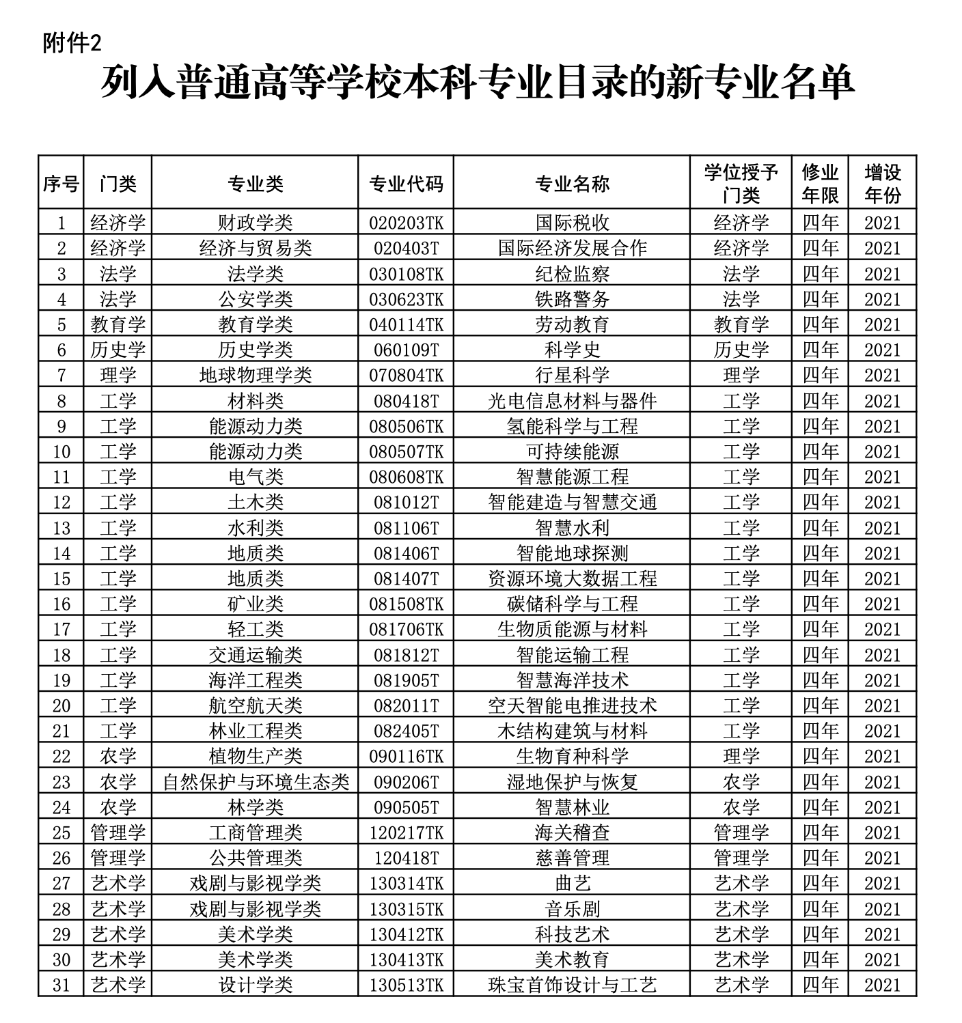 教育部公布的2021年度普通高等學(xué)校本科專業(yè)備案和審批結(jié)果顯示,新增31種本科專業(yè),涵蓋工學(xué)、經(jīng)濟(jì)學(xué)、法學(xué)、藝術(shù)學(xué)等九大學(xué)科門類。