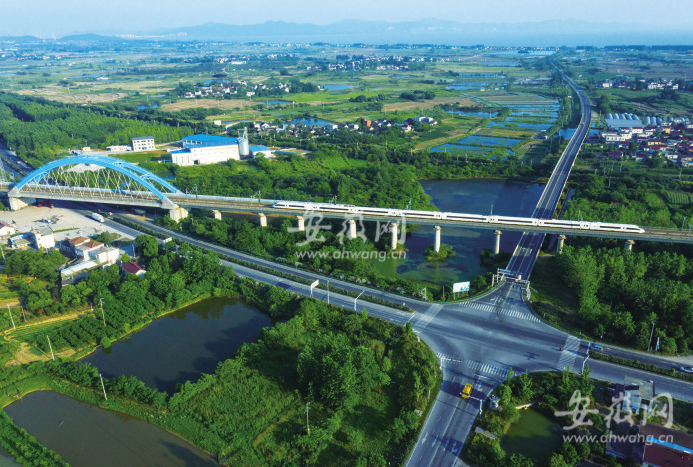 高鐵穿行在巢湖市炯煬至黃麓的省道上空,構(gòu)成一幅立體畫(huà)卷。 劉兵生/攝
