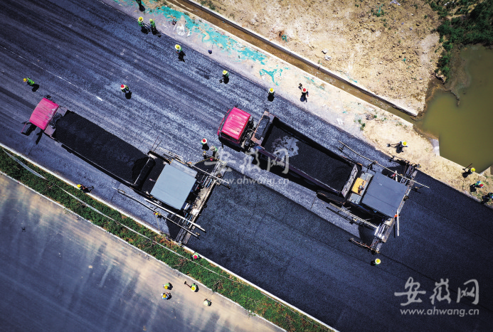 6月15日上午11時(shí)許,烈日當(dāng)空,在肥西縣柿樹(shù)崗鄉(xiāng)S366合六南通道建設(shè)項(xiàng)目工地,多臺(tái)大型施工機(jī)械來(lái)回穿梭,工人們揮汗如雨在進(jìn)行瀝青鋪設(shè)。攝影師們把鏡頭對(duì)準(zhǔn)了他們。
