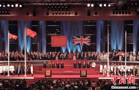 1997年7月1日零點(diǎn),在雄壯的中華人民共和國(guó)國(guó)歌聲中,中華人民共和國(guó)國(guó)旗和香港特別行政區(qū)區(qū)旗冉冉升起。中新社發(fā) 李剛 攝