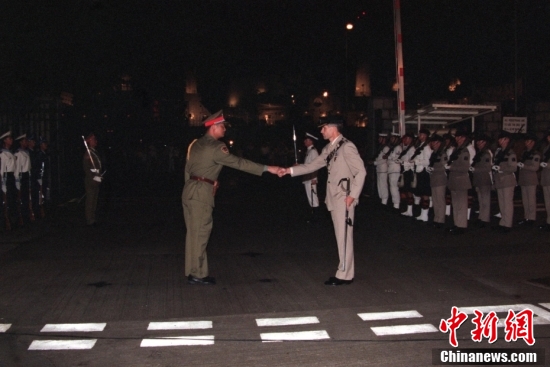 1997年7月1日,中國(guó)人民解放軍駐港先頭部隊(duì)在添馬艦英軍司令部威爾斯親王軍營(yíng)與英軍交接防務(wù)。中新社發(fā) 陳德 攝