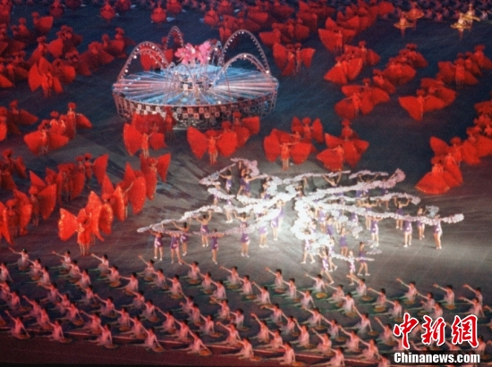 1997年10月12日,中華人民共和國(guó)第八屆運(yùn)動(dòng)會(huì)開幕式團(tuán)體操中表現(xiàn)香港回歸的“紫荊回歸”,香港特別行政區(qū)體育代表團(tuán)首次參加全運(yùn)會(huì)。中新社發(fā) 章黎節(jié) 攝