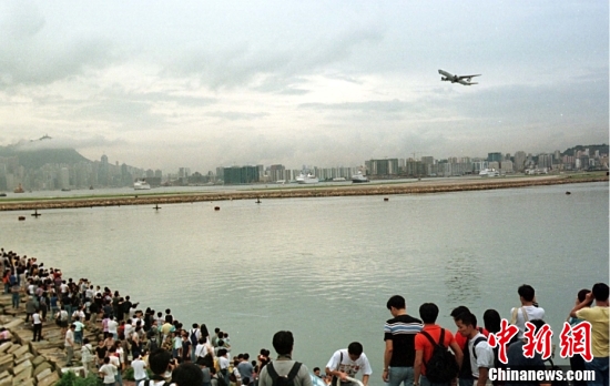 1998年7月,香港國(guó)際機(jī)場(chǎng)即將投入使用,市民告別啟德機(jī)場(chǎng)在官塘堤上爭(zhēng)相留下飛機(jī)起落的鏡頭。中新社發(fā) 楊佐桓 攝