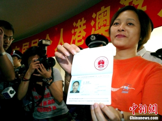 2003年8月20日,廣州、深圳、珠海三地個(gè)人游港澳開始實(shí)施,公安出入境管理部門特別增加受理點(diǎn),以方便市民辦證。圖為廣州市第一個(gè)領(lǐng)證申請(qǐng)人何燕嫦女士。中新社發(fā) 陳文 攝