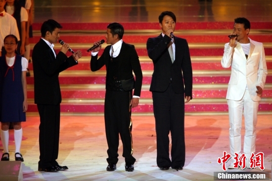 2007年6月30日晚,慶祝香港回歸十周年大型文藝晚會(huì)在香港會(huì)展中心舉行。圖為香港四大天王張學(xué)友、黎明、郭富城、劉德華合唱《始終有你》。中新社記者 武仲林 攝