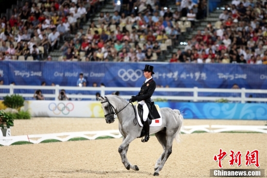 2008年8月9日晚,在香港沙田奧運(yùn)馬術(shù)賽場(chǎng)上,三項(xiàng)賽的盛裝舞步夜間賽事開賽。首位參加奧運(yùn)馬術(shù)比賽的中國(guó)選手華天輕駕愛駒,優(yōu)雅登場(chǎng),香港觀眾怡然欣賞了這場(chǎng)馬的芭蕾表演。中新社記者 洪少葵 攝