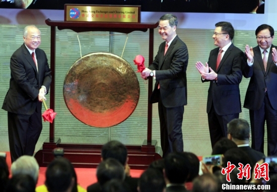 2014年11月17日,香港交易及結(jié)算有限公司(香港交易所)舉行“滬港通”開通儀式。時(shí)任特首梁振英、時(shí)任港交所主席周松崗等嘉賓主持敲鑼典禮。中新社記者 洪少葵 攝