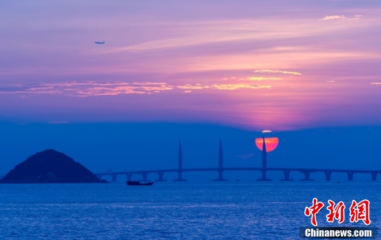 2018年10月22日早晨,港珠澳大橋開通前一天,從廣東珠海的情侶路向東眺望,一輪紅日從東方冉冉升起,將港珠澳大橋映射得格外迷人。中新社記者 張煒 攝