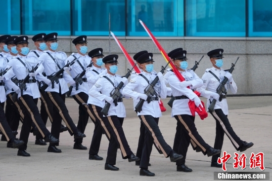 2021年7月1日,香港特別行政區(qū)政府在金紫荊廣場(chǎng)舉行升旗儀式,慶祝香港回歸祖國(guó)及香港特別行政區(qū)成立24周年。圖為七一升旗禮護(hù)旗方隊(duì)首次以中式步操入場(chǎng)。中新社記者 張煒 攝
