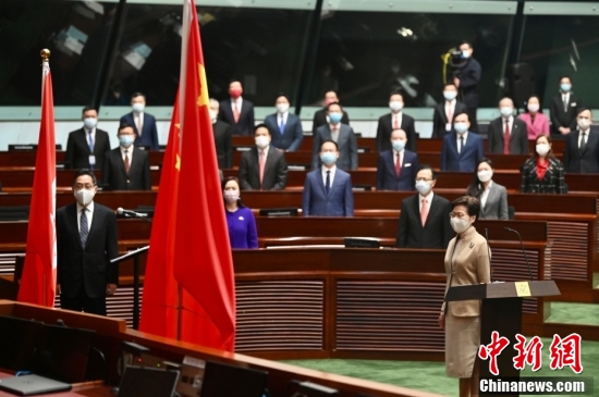 2022年1月3日,香港特區(qū)第七屆立法會(huì)議員宣誓儀式在立法會(huì)綜合大樓會(huì)議廳進(jìn)行,監(jiān)誓人特區(qū)行政長(zhǎng)官林鄭月娥確定全體90位候任立法會(huì)議員的宣誓為有效宣誓。圖為林鄭月娥與議員面向國(guó)旗及區(qū)旗唱國(guó)歌。中新社記者 李志華 攝