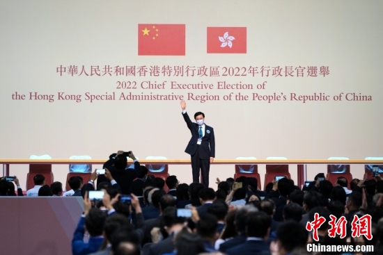 2022年5月8日,李家超當(dāng)選香港特別行政區(qū)第六任行政長(zhǎng)官人選。圖為李家超當(dāng)選后揮手致意。中新社記者 張煒 攝