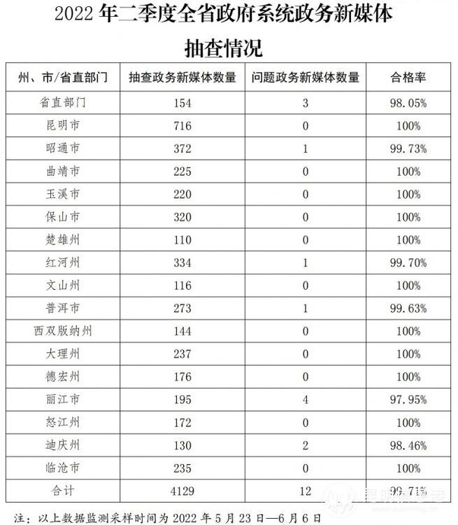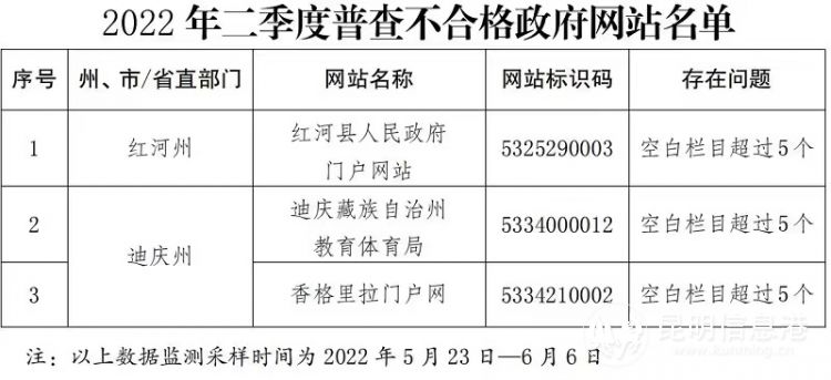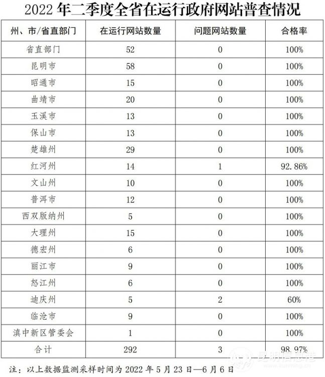 昆明信息港訊 記者黃彩英 日前,云南省人民政府辦公廳通報2022年二季度全省政府網站和政府系統(tǒng)政務新媒體檢查情況顯示,全省在“全國政府網站信息報送系統(tǒng)”中登記的在運行政府網站292個,普查發(fā)現(xiàn)3個政府網站不合格,在“全國政務新媒體信息報送系統(tǒng)”中登記的在運行政務新媒體4129個,檢查發(fā)現(xiàn)12個不合格。