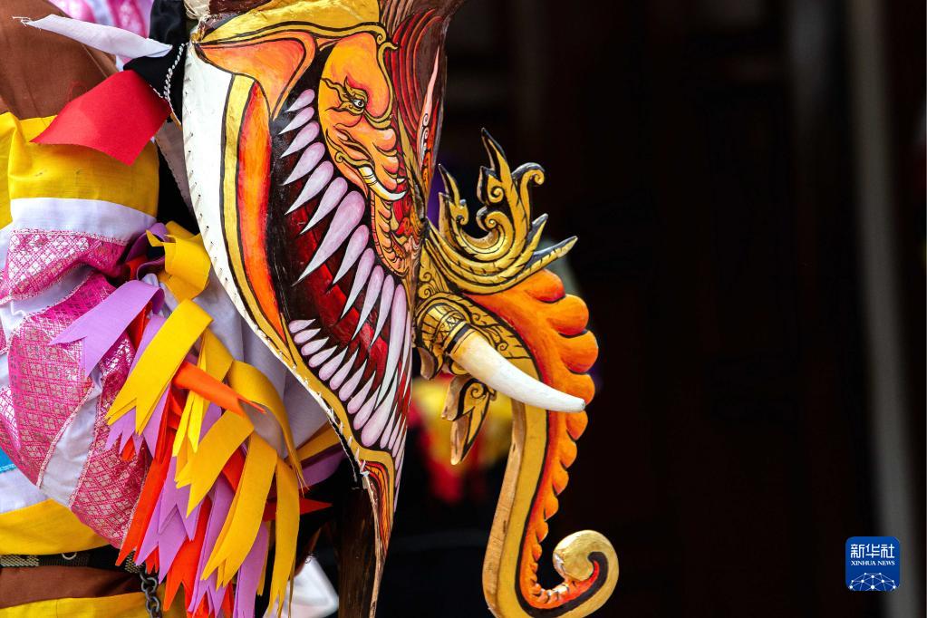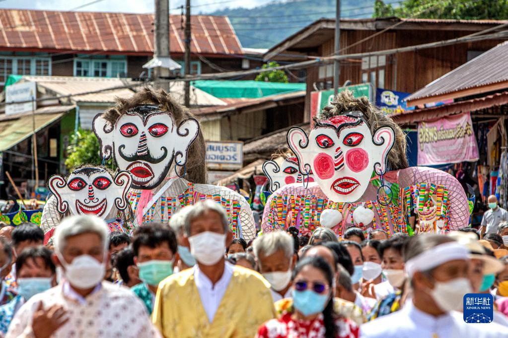 7月1日,在泰國(guó)黎府,人們頭戴面具載歌載舞。新華社記者 王騰 攝