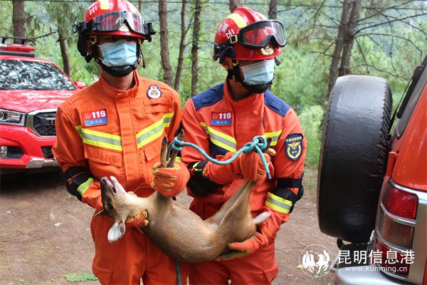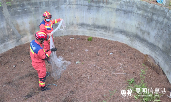 18時28分,救援人員到達現(xiàn)場,經(jīng)觀察及詢問報警人得知誤入水池的赤麂前肢有明顯裸露外傷特征?,F(xiàn)場蓄水池深約2米,無水,指揮員首先組織2名消防救援人員沿軟梯下到水池中,為防止赤麂受到驚嚇致二次傷害,消防救援人員利用漁網(wǎng)進行抓捕,待抓到后再繩子將前后肢進行捆綁固定,在經(jīng)過10分鐘的救助后,赤麂被成功救出水池。