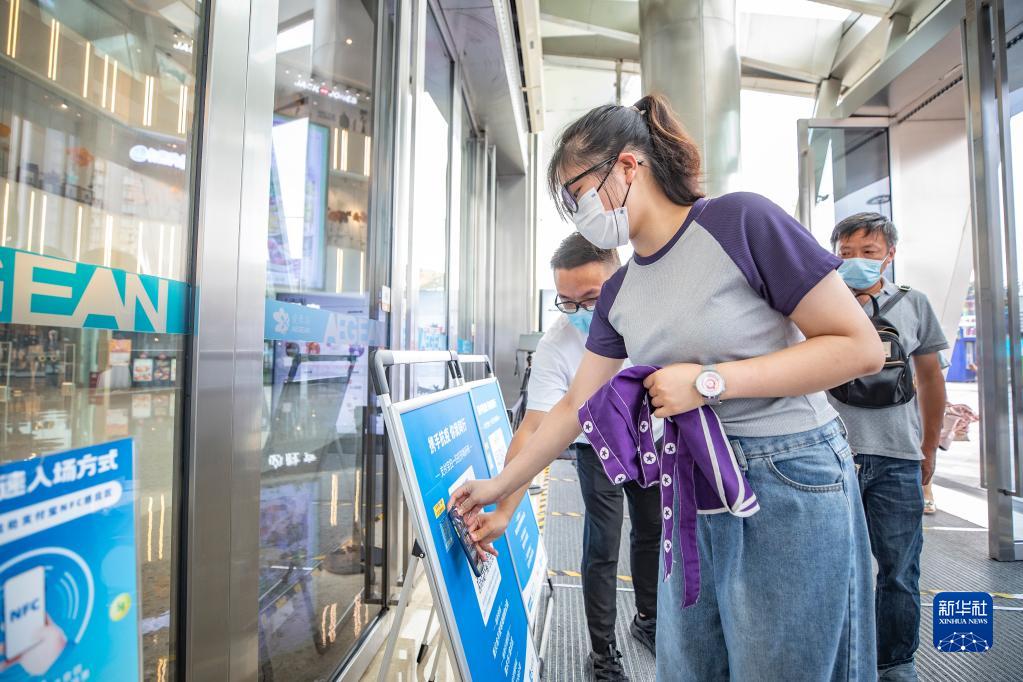 7月4日,在重慶兩江新區(qū)一購(gòu)物公園內(nèi),顧客使用NFC功能完成入場(chǎng)登記。新華社 記者黃偉攝