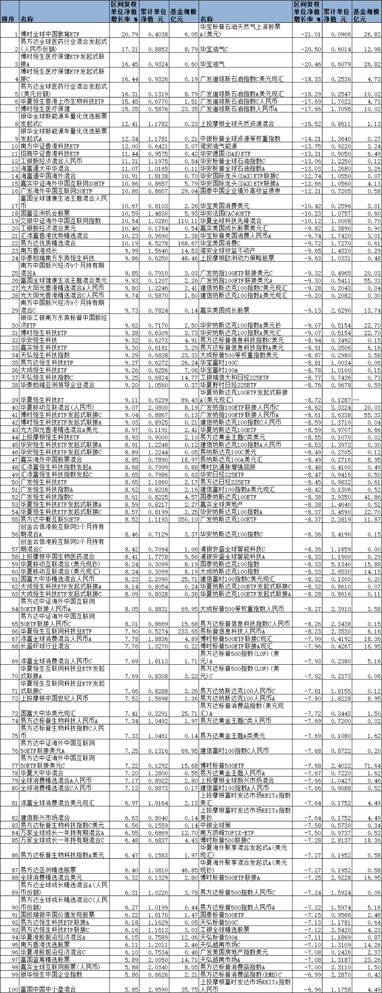 2022年6月份QDII基金漲跌幅前100名