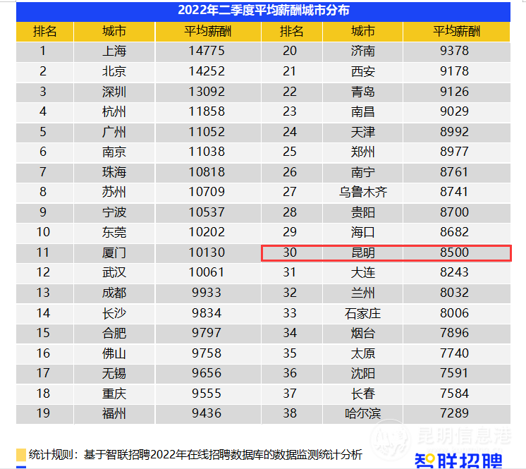 智聯(lián)招聘近日發(fā)布2022年第二季度《中國企業(yè)招聘薪酬報告》,其中指出,本季度全國平均招聘薪酬為10341元/月,環(huán)比上漲3.3%,高技術制造、集成電路、生物醫(yī)藥、汽車等產(chǎn)業(yè)薪酬上漲快,制藥等崗位薪資漲勢好,物流人才薪資也在提升。昆明以8500元的平均招聘薪酬,位列本季度全國38個核心城市的第30名。