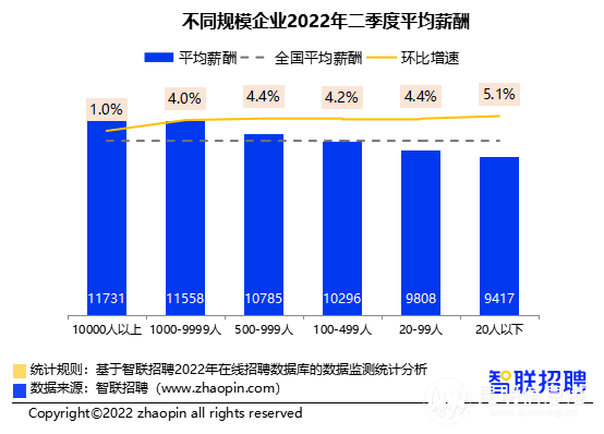 從企業(yè)規(guī)模來看,二季度依然是企業(yè)規(guī)模越大,招聘薪酬越高。但從薪酬變化看,本季度小微企業(yè)漲幅更高。從企業(yè)性質(zhì)來看,上市公司以11584元的招聘月薪繼續(xù)穩(wěn)居首位,與上季度相比平均招聘薪酬上升3.8%。合資企業(yè)的招聘薪酬排名升至第二,平均月薪為11292元,比上季度提高4.3%。外商獨資企業(yè)平均招聘薪酬為10976元/月,環(huán)比增長5.9%,位列第三。本季度國企的平均招聘薪酬為10973元/月,較上季度僅提升0.7%,排名降至第四位。股份制企業(yè)和民營企業(yè)的招聘薪酬雖然仍低于全國平均水平,但較上季度有明顯增長,增幅分別為4.2%、4.5%,并且都超過萬元門檻。(昆明信息港 記者江楓)
