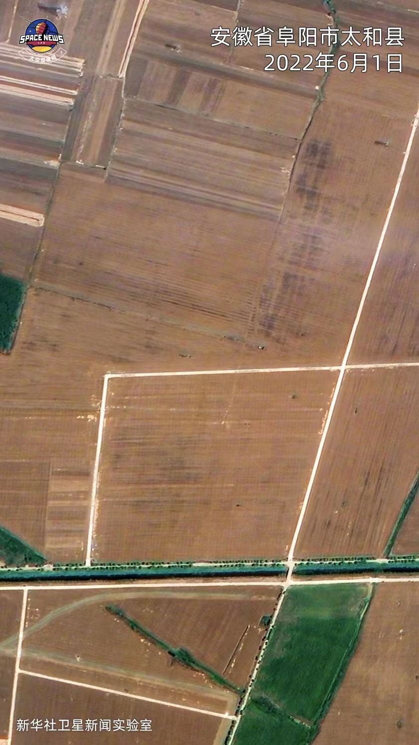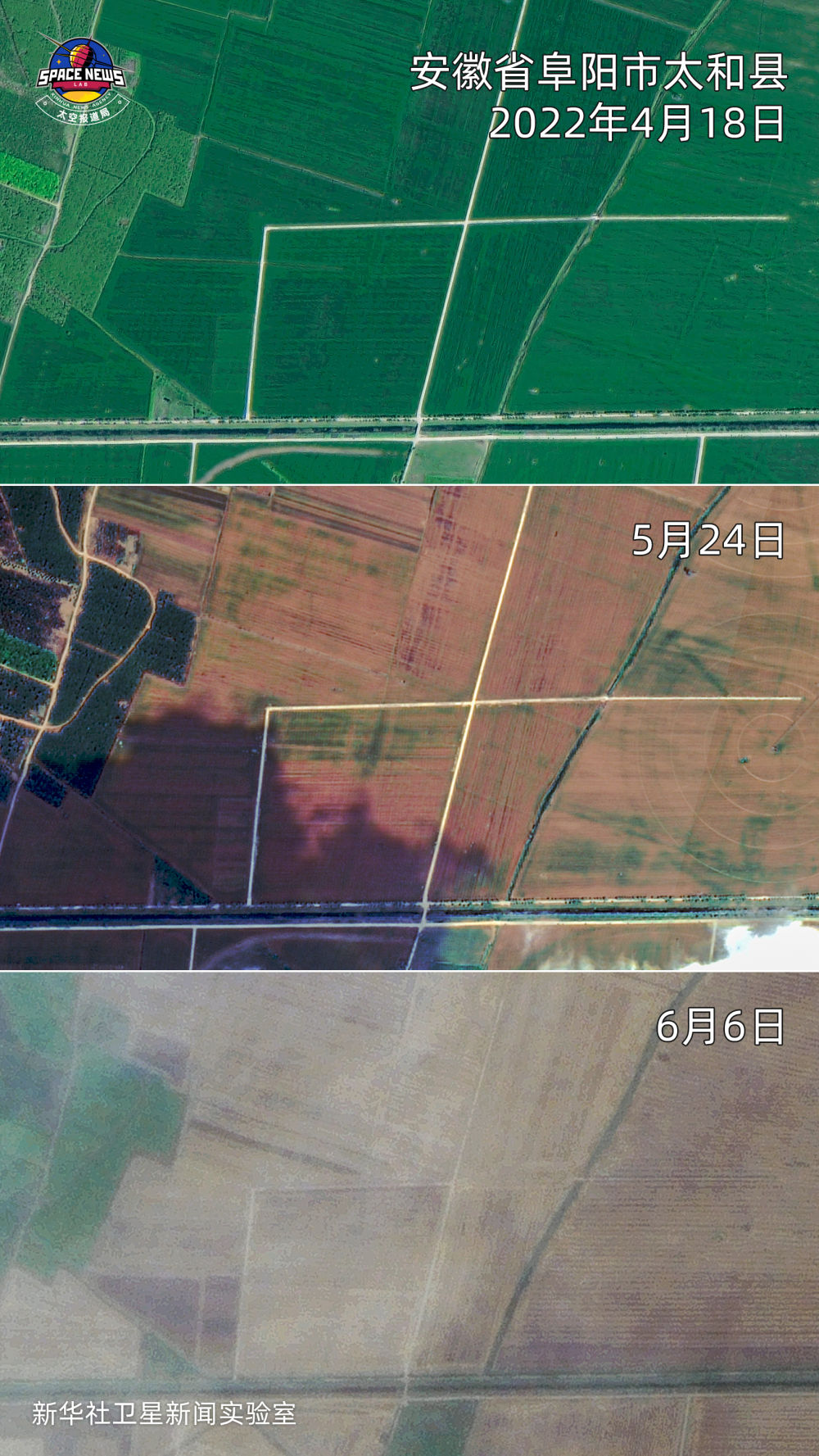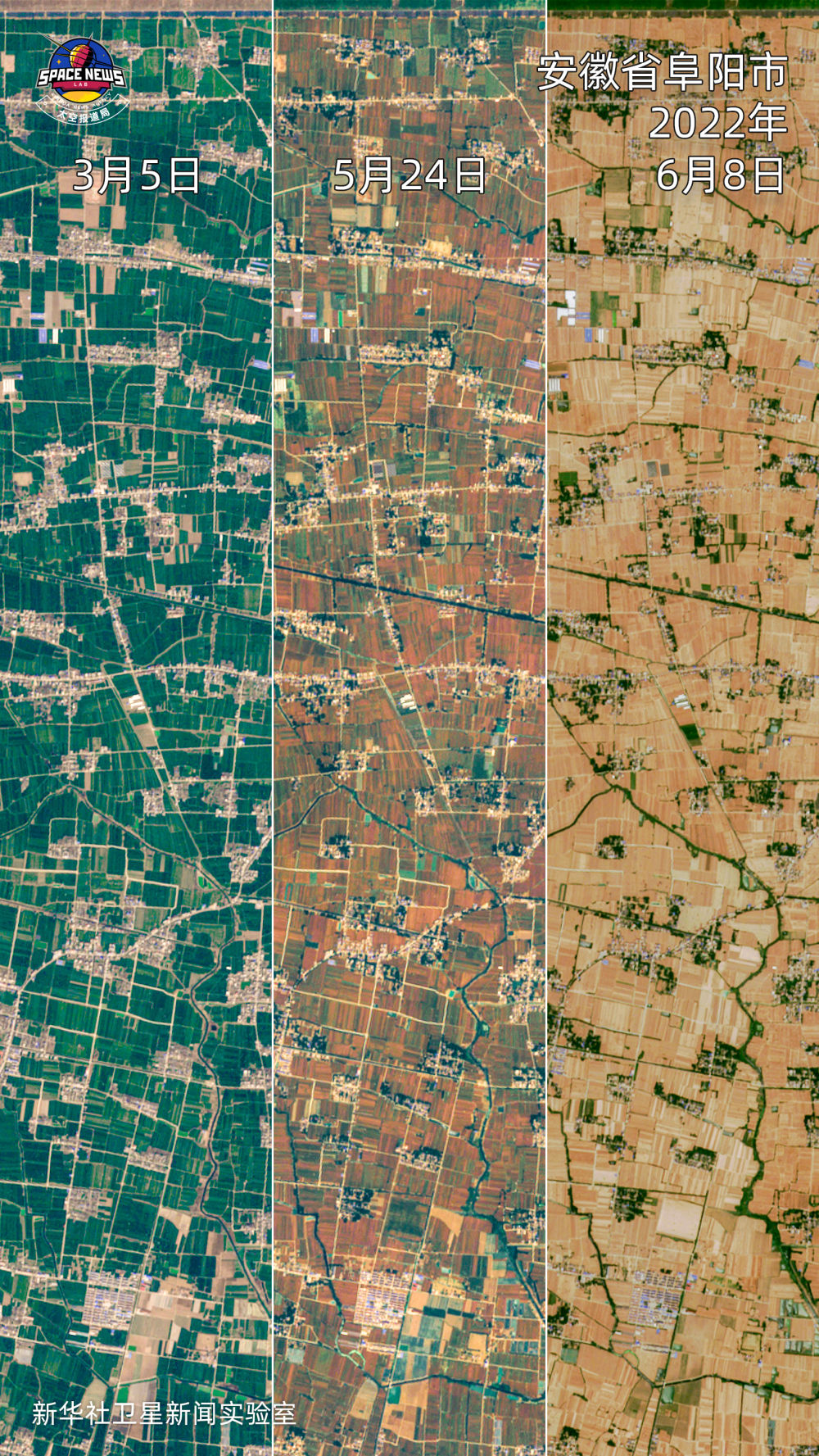 從衛(wèi)星俯瞰安徽省阜陽市,2022年由春轉(zhuǎn)夏,麥田從春耕春管時(shí)的一片碧綠,逐漸轉(zhuǎn)為待收割時(shí)的一片深黃,再到已收割后的淺黃。