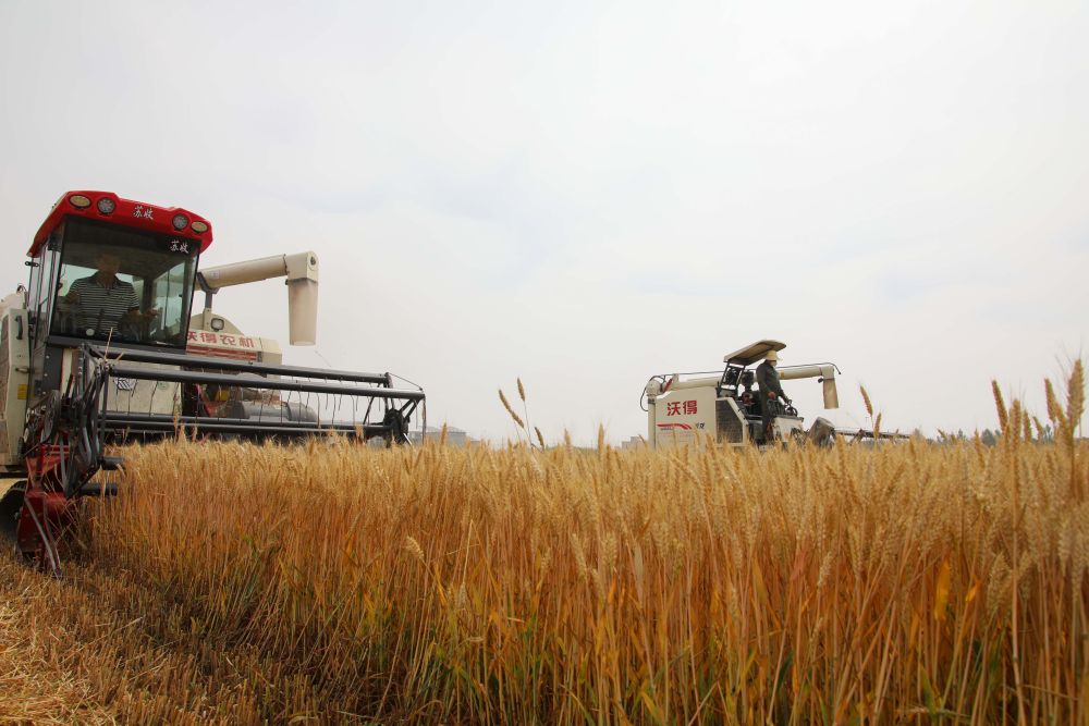 5月27日,在安徽省阜陽市潁上縣五十鋪鄉(xiāng),農(nóng)機(jī)手操作機(jī)械設(shè)備收割小麥。新華社記者 曹力 攝
