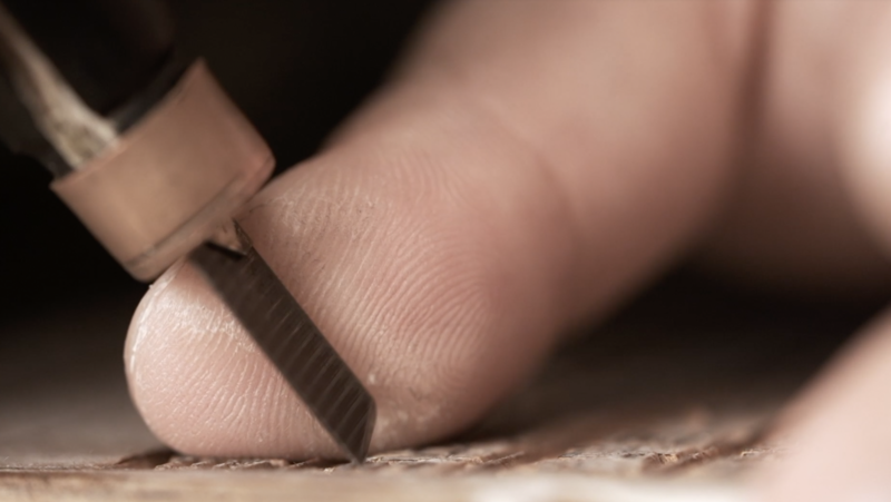 在雕版環(huán)節(jié)中,右手握刀,左手頂住刀背,經(jīng)過發(fā)刀和挑刀兩道工序之后,漢字逐漸成型。