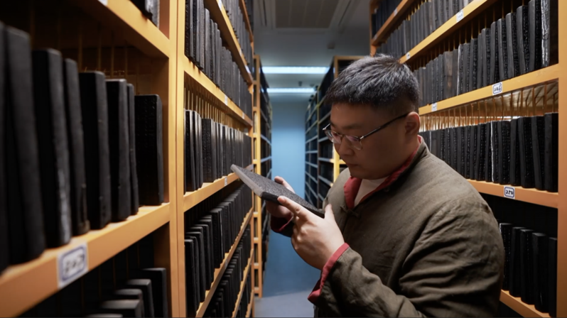 兩位師父以外,王康成長也離不開與古人的“對話”。在刻經(jīng)處后庭的經(jīng)版樓內(nèi),藏有12.5萬片經(jīng)版,那是一代又一代匠人的心血,正門兩側(cè)“流通功德藏,接續(xù)人天師”的描金對聯(lián)敘述著這里的法脈傳承。