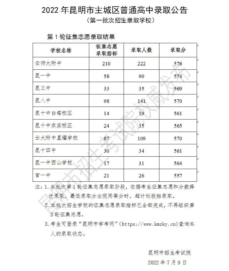 昆明信息港訊 記者上官艷君 7月9日,昆明市招生考試院公布2022年昆明市主城區(qū)普通高中第一批次第1輪征集志愿錄取結(jié)果。