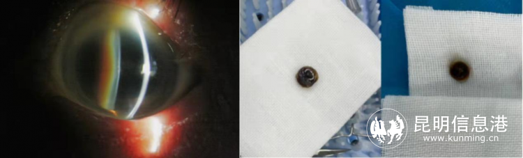 圖:術(shù)前眼部照/陳奶奶術(shù)后取出的白內(nèi)障晶體