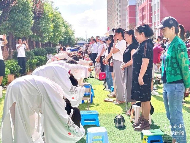 書香校園內(nèi),畢業(yè)禮現(xiàn)場一片歡騰,恍若時(shí)代穿越。六年級(jí)的孩子們精心打扮,身著各式國風(fēng)服飾,端莊大方,衣袂飄飄,在風(fēng)雅音樂中將中國傳統(tǒng)禮儀陸續(xù)演繹。