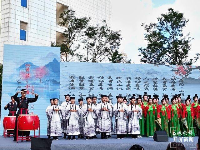 詩詞朗誦鞏固傳統(tǒng)文化之根,畢業(yè)班孩子以《詩經(jīng)》中多個(gè)經(jīng)典篇目或改編表演,或深情吟誦,如《國風(fēng)·衛(wèi)風(fēng)·木瓜》《國風(fēng)·秦風(fēng)·無衣》等,涉及反映傳統(tǒng)美德、社會(huì)風(fēng)貌、愛國情懷等多方面的主題,傳承國學(xué)精髓。