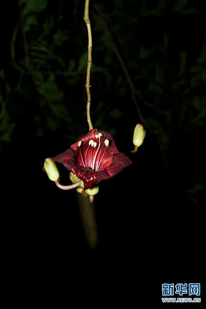 吊瓜樹。花朵紫紅色,寬鐘狀,可由夜間活動的蛾類或蝙蝠傳粉(攝于6月21日)。新華網發(fā)(莫海波/攝)