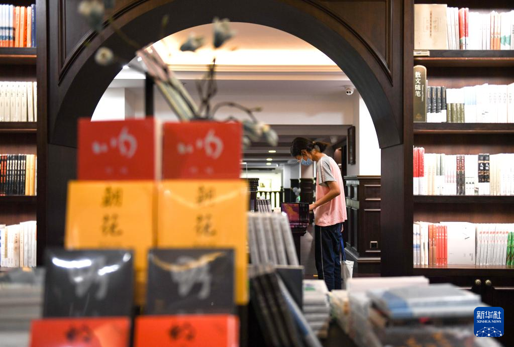 7月12日,西安市鐘樓附近一書店內(nèi),一名女孩在文學(xué)區(qū)書架前瀏覽。 新華社發(fā)(鄒競一 攝)