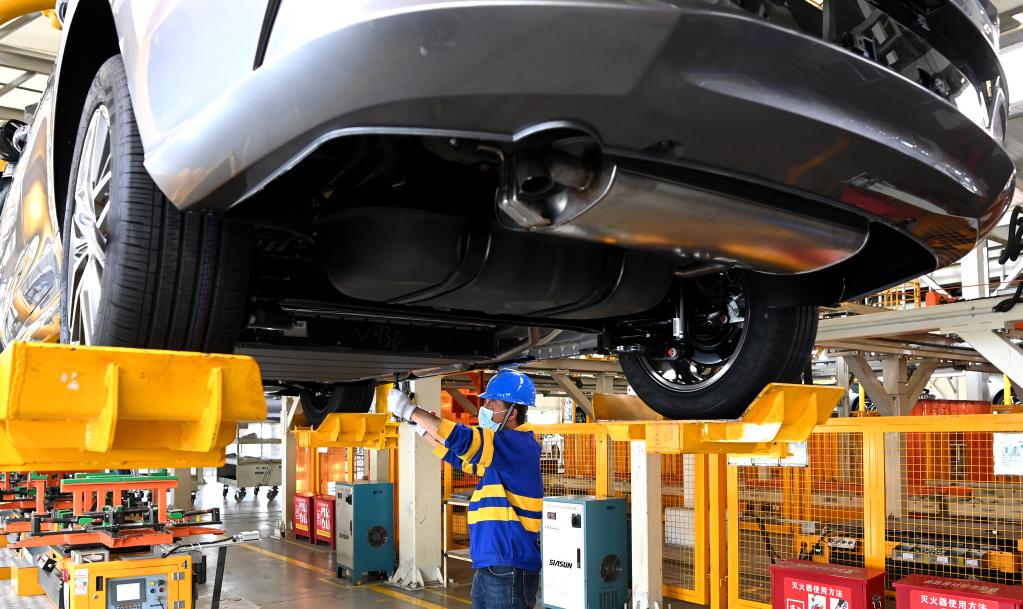 4月20日,工作人員在西安比亞迪草堂工業(yè)園汽車總裝廠進(jìn)行新能源汽車裝配。(新華社記者劉瀟攝)