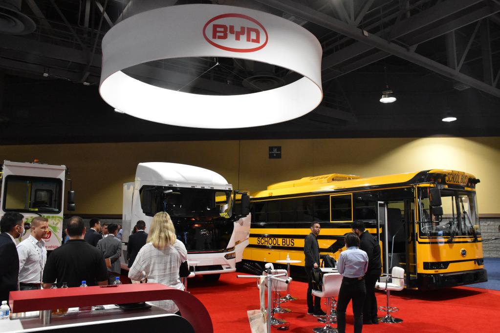 5月10日,人們?cè)诿绹?guó)加利福尼亞州長(zhǎng)灘市舉行的2022年先進(jìn)清潔運(yùn)輸博覽會(huì)上參觀比亞迪展區(qū)。(新華社發(fā),曾慧攝)