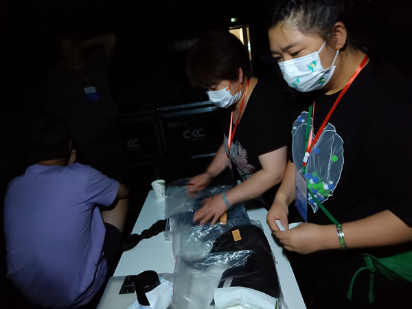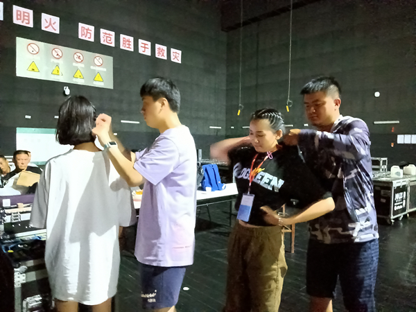 第二天清晨,導(dǎo)演常浩老師帶領(lǐng)演員們對光、走臺,每個演職人員都全身心地投入工作中。由于巡演時間長,加上舟車勞頓、天氣炎熱等原因,有些演員感冒咳嗽、嗓子嘶啞了,他們吃著消炎藥,把咽癢膏涂抹在咽喉處,還一把一把地口含咽立爽,試圖用這樣的方法快速消除咽喉部位的不適;午餐過后,化妝間、側(cè)幕臺等地方隨處可見或伏案、或席地作短暫休息的演職人員;下午2:00,全體演員準備化妝,負責(zé)化妝和服裝、道具的老師就開始忙碌起來了;晚上7:30,大幕拉開,演出正式開始。每當(dāng)演出轉(zhuǎn)場間隙,服裝道具老師早早等候在側(cè)幕臺給演員“搶妝”,轉(zhuǎn)場時場上燈光瞬間熄滅,演員們眼前漆黑一片,這時,總有一雙溫暖的手伸過來,攙扶著即將從高臺上撤下來準備再出場的演員,生怕他們因光線暗看不清臺階而跌倒;待演出結(jié)束后,舞美隊的同志們又連夜拆臺、裝車,一路奔波在趕往下一站的夜色中。