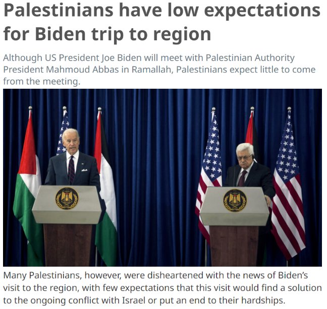 雖然此訪期間,拜登與巴勒斯坦總統(tǒng)阿巴斯舉行了會談并表示支持兩國方案,但并未采取任何實際行動糾正特朗普政府的“偏以”政策。