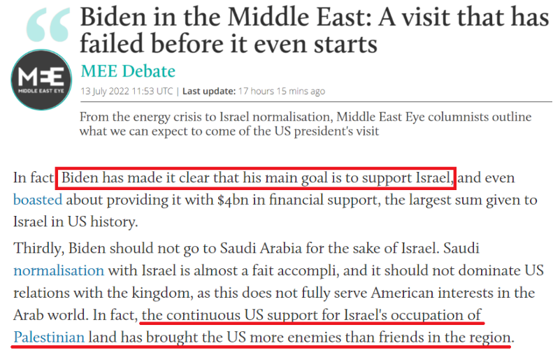 英國“中東眼”新聞網(wǎng):拜登明確表示,他此訪的主要目標是支持以色列。