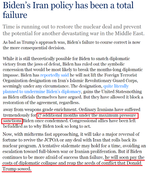 文章說,拜登本來有機會果斷告別前任的失敗做法,并表明華盛頓認真履行其國際承諾,但他卻遲遲無所作為。相反,在他曾經(jīng)譴責的特朗普式極限施壓制裁下,伊朗民眾又遭受了17個月(拜登上臺至今的時間)的巨大痛苦。