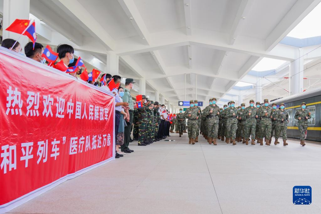 老撾國防部、老撾人民軍總后勤部代表,我軍援助老撾醫(yī)學(xué)專家,老中鐵路有限公司人員等在萬象站迎接醫(yī)療隊一行。歡迎人員揮舞中老兩國國旗,手持“熱烈歡迎中國人民解放軍‘和平列車’醫(yī)療隊抵達萬象”橫幅歡迎醫(yī)療隊抵達。