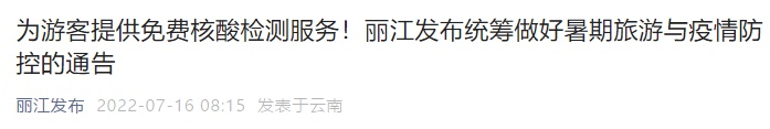 為全面落實“外防輸入、內(nèi)防反彈”總策略、“動態(tài)清零”總方針和“疫情要防住、經(jīng)濟要穩(wěn)住、發(fā)展要安全”總要求,切實提升疫情早發(fā)現(xiàn)、早處置能力,為廣大來麗游客提供溫馨高效的疫情防控服務,根據(jù)《新型冠狀病毒肺炎防控方案(第九版)》有關要求,現(xiàn)將統(tǒng)籌做好暑期旅游與疫情防控6條服務措施通告如下: