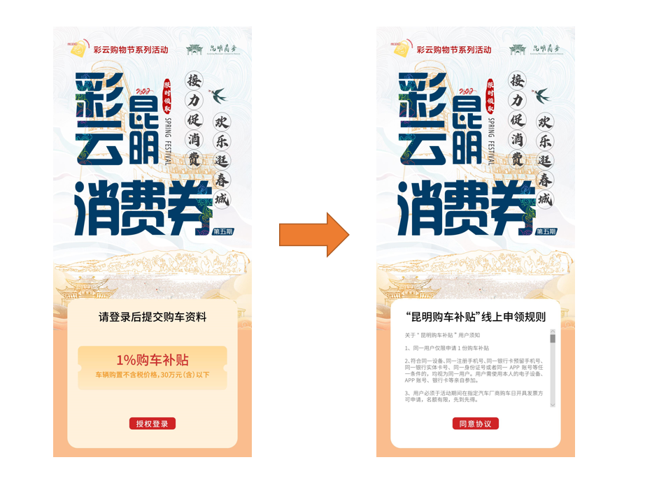 5.購(gòu)車消費(fèi)者授權(quán)登錄“昆明市補(bǔ)貼專區(qū)”,認(rèn)真閱讀“昆明購(gòu)車補(bǔ)貼線上”申領(lǐng)規(guī)則,并點(diǎn)擊同意(參照?qǐng)D例2,以云閃付App實(shí)際為準(zhǔn))。